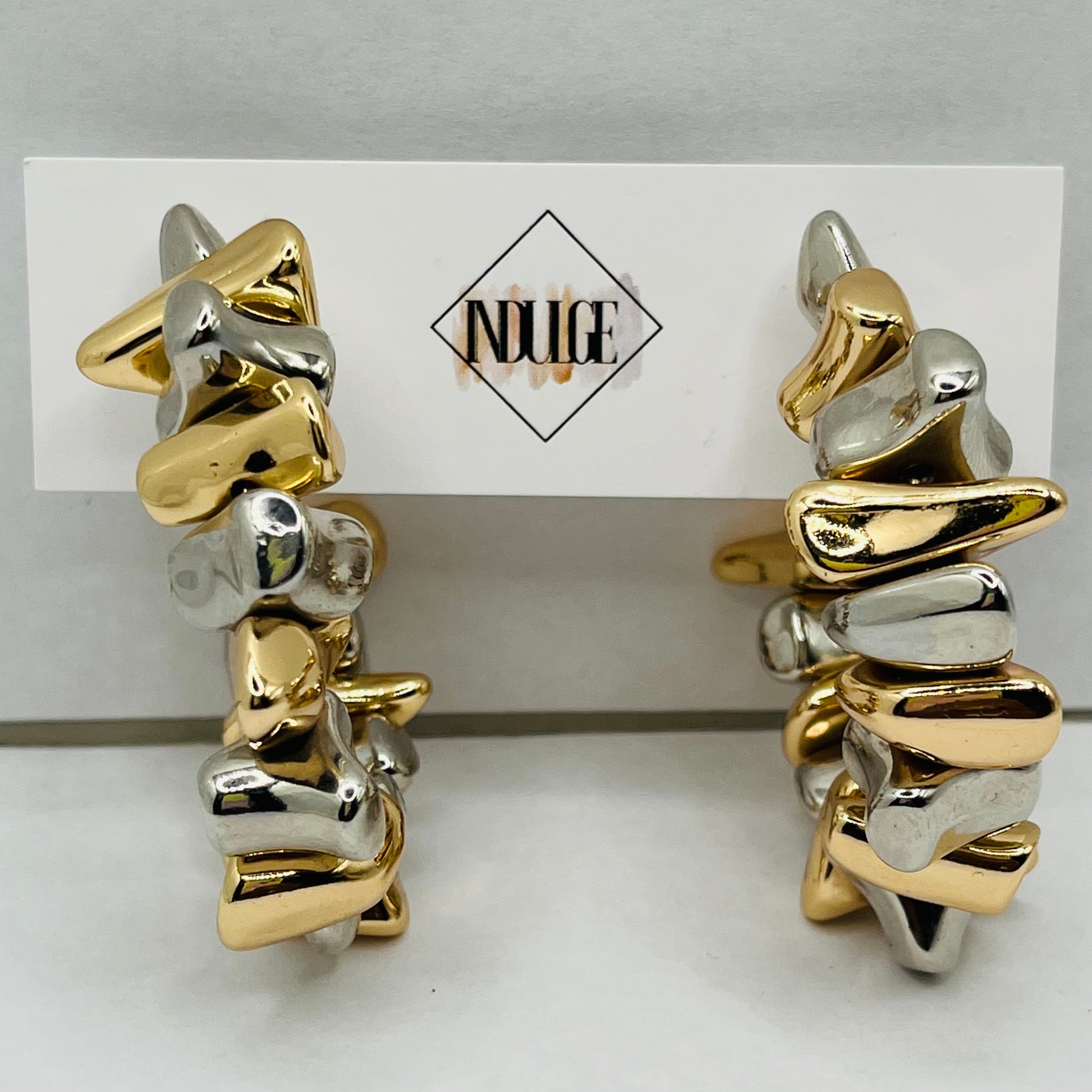 Make a bold yet effortless statement with our Pebble Metal Mixed Hoop Earrings. Designed with a unique cluster of molten-style metal accents in both gold and silver tones, these hoops bring modern edge and sculptural beauty to any look.